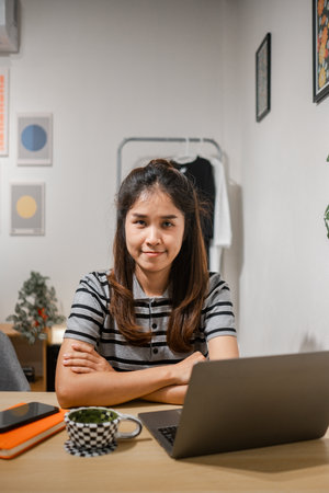Asia business woman feeling happy smiling and looking to camera while relax at home office. Young asian woman working using laptop on desk in living room at home.