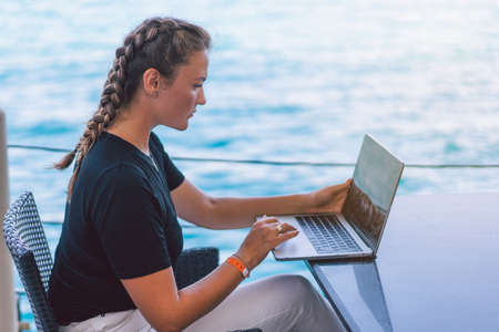 female freelancer working by the sea, using laptop computer. Freelance work concept, technology, travel and vacation