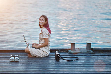Happy woman sitting in pier with laptop. Freelance job or distance learning idea. Work while travel concept, copy space