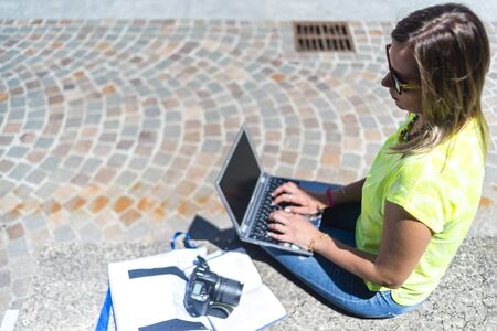 young girl photographer sitting with camera and laptop outdoors and retouching photo, tourist freelancer on a background of city sunset