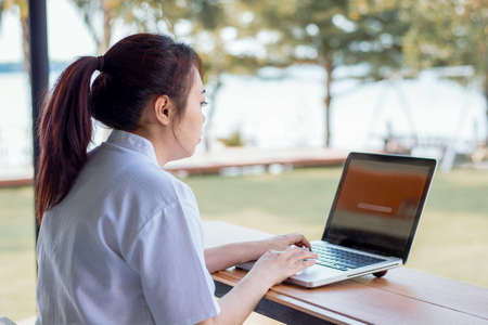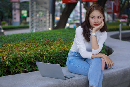Asian young woman or young student sitting with laptop outdoors, online learning concept.