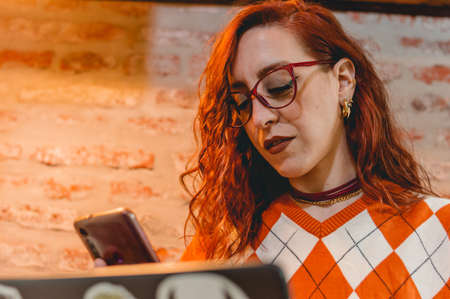 a red-haired freelance woman with glasses works remotely on a laptop in a cafe.x