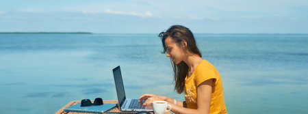 Panoramic image freelancer woman working on laptop computer outdoors by blue sea beautiful summer view. Dream office job workplace. Design banner with copy space