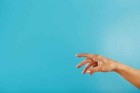 Female hand with bright manicure pointing away with forefinger showing finger gun gesture on blue background