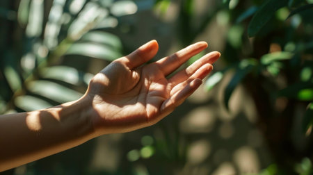 Gentle sunlight casts intricate shadows on an outstretched hand amid lush foliage, evoking a sense of calm and connection with nature. Captured in vivid detail. Generated A.I.