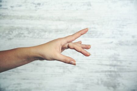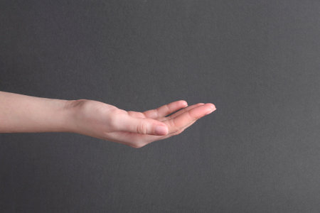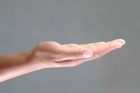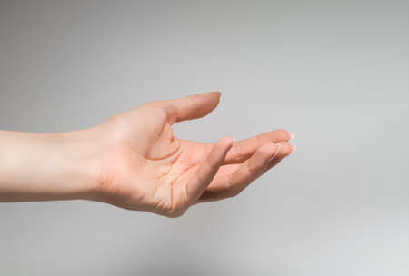 Beautiful woman's hand on the gray background.