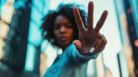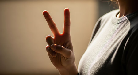 A woman with a hand raised in the air, making a peace sign. The image has a bright and positive mood, conveying a sense of unity and harmony