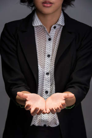 Woman open empty hand on black background.