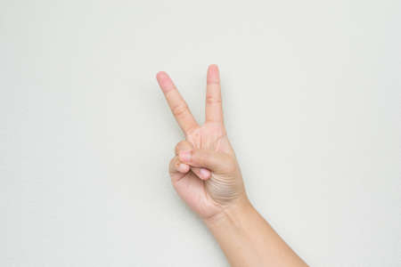 Gesture and sign, hand on a white background. Hand showing peace or victory