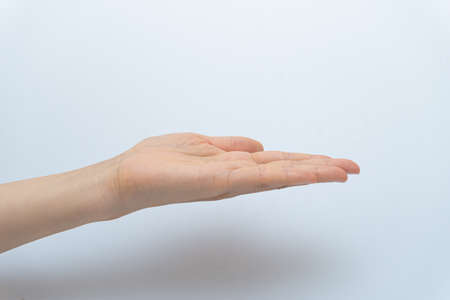 Empty female hand with copy space for showing or presenting product isolated on white background