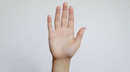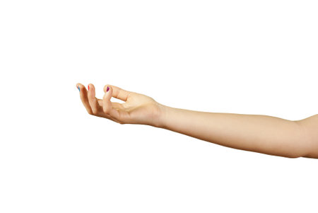Open female hand, palm facing upwards, isolated on white background, providing a minimalist and neutral backdrop -
