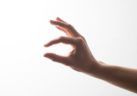 A close-up shot of a human hand, with fingers delicately pinched to indicate a small size or measurement, isolated against a bright white background.