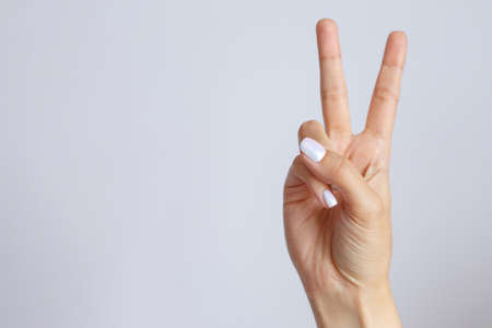 Female hand showing victory sign on a blurred background. Close-up.