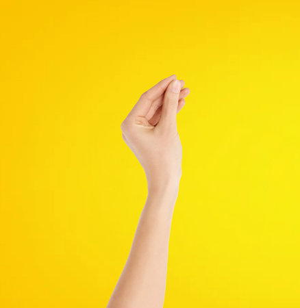 Female hand on yellow background, closeup of female hand gesturing