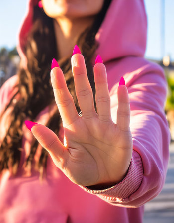 A persons hand with a white shirt and pink background, AI