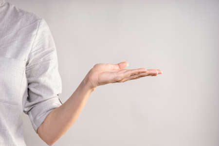 Elegant female hand, pointing to the side. palm holds something, a blank for the design. businesswoman in a casual gray shirt makes a hand gesture