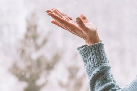 Outstretched empty hand of the girl. Snowy background pastel blue.