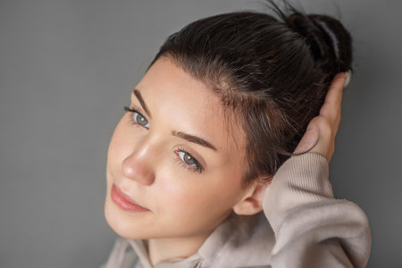 Close up portrait of a beautiful young woman with brown eyes looking at camera