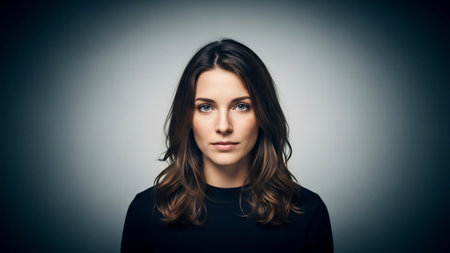 A woman with a black shirt and brown hair looking at the camera, AI