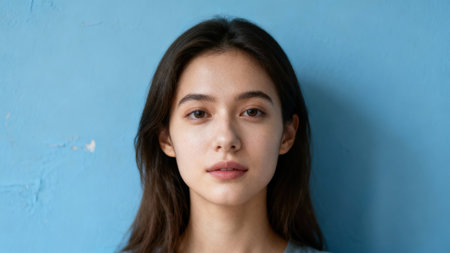 Centered portrait of a serious young woman featuring clear skin and dark wavy hair against a bright, textured cyan blue background, illuminated by soft front lighting.