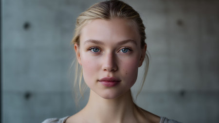 A young woman with blonde hair pulled back and striking blue eyes looks directly at the camera. Her skin has a natural glow with a few freckles visible on her cheeks. She is wearing a grey top and the background is a blurred concrete wall.