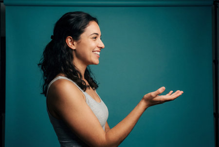 Young woman with long wavy black hair smiles in profile side view against vibrant teal background while extending hand in cheerful welcoming pose