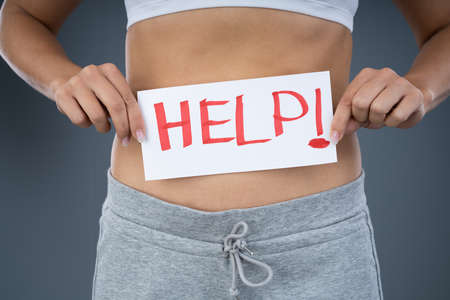 Woman With Stomach Pain Showing Help Sign On Piece Of Paper
