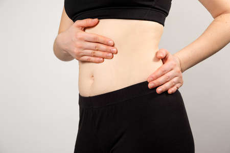 Vacuum belly close up. A swarthy girl in a sports uniform with a slender body pulls in her stomach