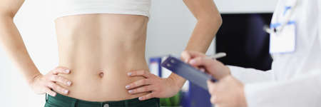Young woman with naked belly standing in front of doctor in clinic closeup
