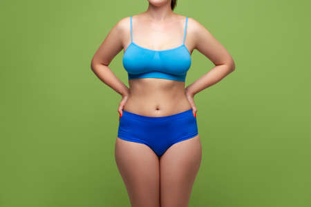 slim girl showing her slim waste, fat stomach. close up cropped photo. ideal body, isolated blue background, studio shot