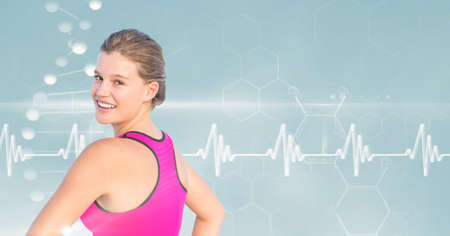 Caucasian woman looking behind against dna structure and heart rate monitor with copy space. sports technology and medical science concept