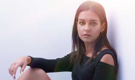 Beauty portrait of a sensual, dreaming girl with straight brunette hair, dressed in modern clothes, with makeup.