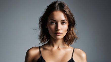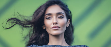 A confident woman stands with her hair gently blowing in the breeze against a striking green backdrop. She gazes directly at the viewer with poise showcasing her natural beauty.