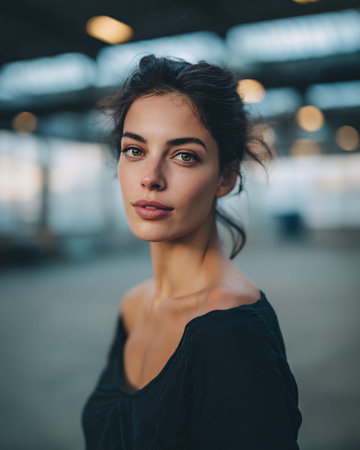 A young woman with dark hair and green eyes, wearing a dark off-the-shoulder top, looks directly at the camera with a neutral expression. The background is blurred, suggesting an outdoor or industrial setting with soft lighting.