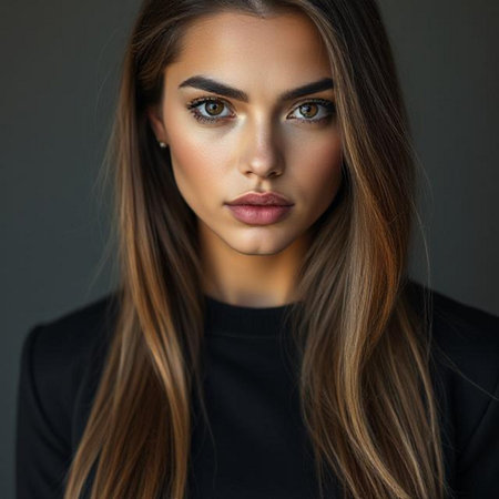 A woman gazes directly at the viewer showcasing her striking eyes and natural beauty. Her hair falls softly around her face while the blurred backdrop creates an intimate and engaging atmosphere.