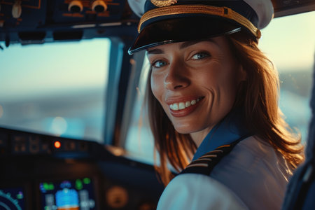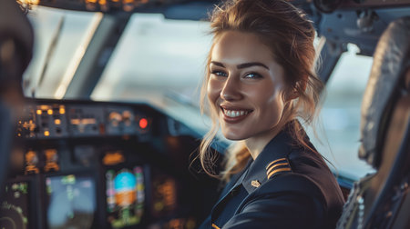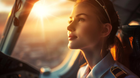 Confident female pilot in cockpit during golden hour