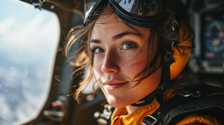 Portrait of a young woman parachutist in the cockpit of a helicopter