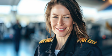 A composed and inspiring female pilot beside a commercial aircraft, showcasing professionalism and determination in her uniform, a role model in aviation leadership, banner