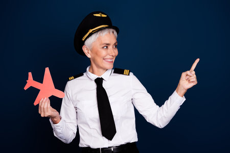 Photo of pensioner lady commercial pilot hold paper plane point look empty space dressed aviator uniform isolated on dark blue background