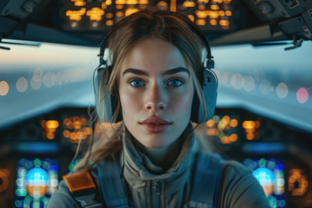 Focused female aviator with headset pilots commercial aircraft in serene twilight hour, demonstrating experience and professionalism in aviation