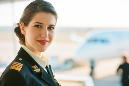 Poised and authoritative, a female airline captain stands next to a jet on the runway, embodying expertise and empowerment in the modern aviation industry