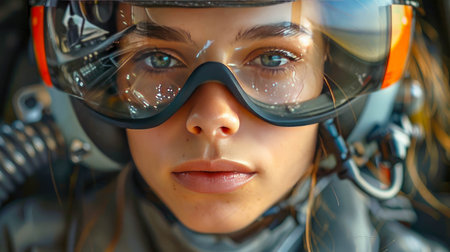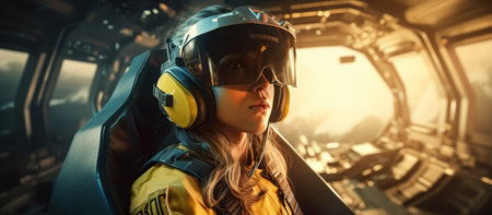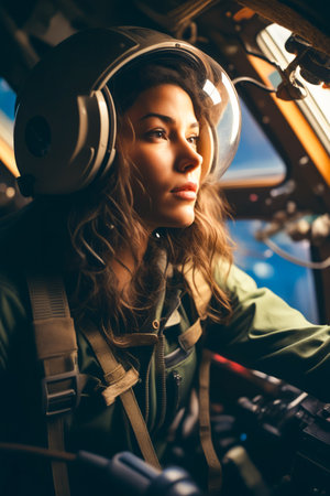 artistic close-up of a female aviator inside the cockpit at the helm and side panel, on her head a special headgear for protecting ears and glasses