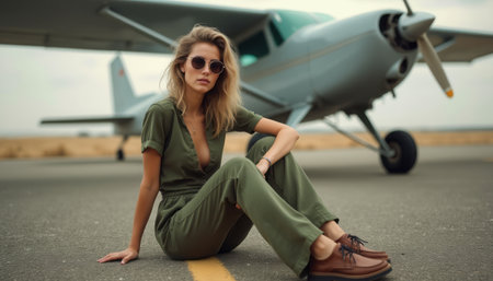 A stylish woman in a green jumpsuit sits casually on the tarmac, exuding confidence and coolness against the backdrop of a vintage airplane. Her sunglasses reflect a sense of adventure, while the muted colors of the scene evoke a laid-back, yet daring atmosphere, perfect for a spontaneous getaway.