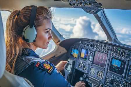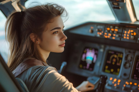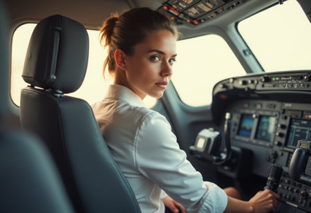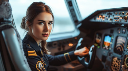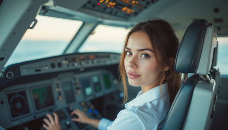 A poised young woman sits confidently in the cockpit of an aircraft, her gaze directed towards the viewer with a hint of a smile. The intricate array of controls and instruments behind her reflects the high-stakes world of aviation, while the soft light filtering through the windows adds a serene atmosphere to this powerful moment.
