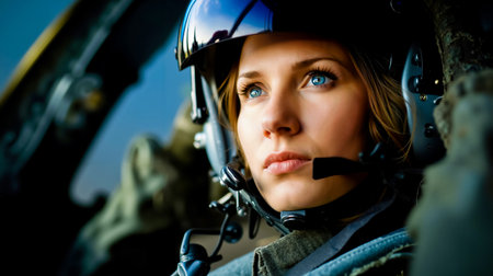 Empowering image of a female helicopter pilot in uniform, promoting gender equality with her confident stance near the aircraft