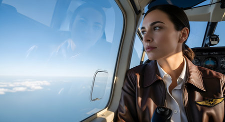A confident female pilot, wearing a classic brown leather flight jacket, sits in the cockpit of a small aircraft. She gazes thoughtfully out the window at the sky and clouds, her reflection visible in the glass, representing themes of career, ambition, and freedom.