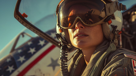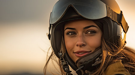 Portrait of a determined woman pilot in uniform with aviator sunglasses against a sunset sky