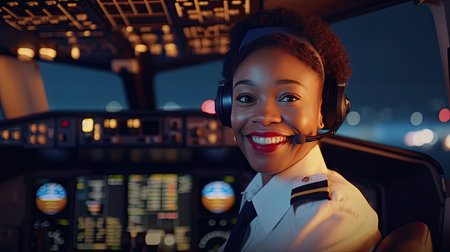 African American womanairline pilot in the cockpit. Concept of woman in aviation, pilot profession, cockpit, flight deck.