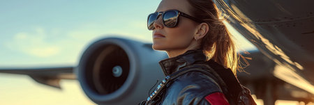 Confident female pilot smiling on the airport tarmac with a jet engine at golden hour