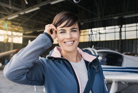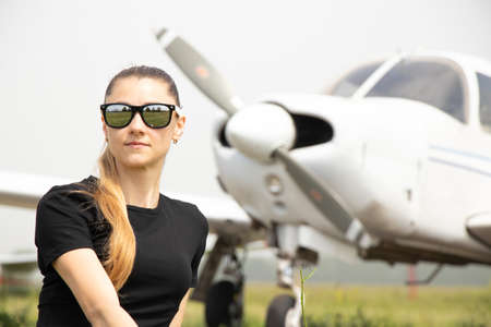 Portrait of a young woman pilot in the cockpit of a plane